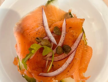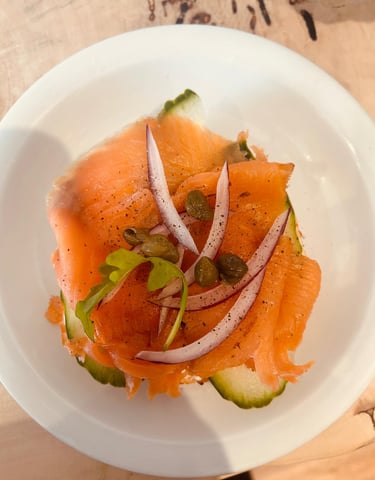 Fresh salmon slices · cream cheese · cucumber · onion · capers · agave syrup.
