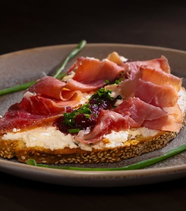 Ricotta cheese · prosciutto ·tart cranberry with garlic ·agave syrup · on artisan toast.